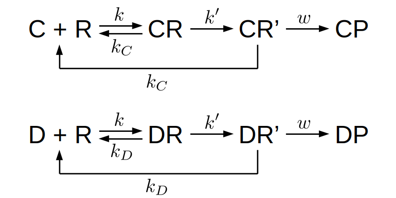 Here \(C\) denotes the correct substrate, \(R\) the recognition site, \(\mathit{CR}\) the correct substrate bound to the recognition site, and \(\mathit{CP}\) the correct product. Similarly, \(D\) denotes a wrong substrate, \(\mathit{DR}\) the wrong substrate bound to the recognition site, and \(\mathit{DP}\) the defective product. Notice that we have assumed that the correct and wrong substrates have the same binding rate, \(k\), to the recognition site, as well as the same incorporation rate, \(w\). The only difference between the correct and wrong substrates is in the unbinding rate, \(k_C\) and \(k_D\) respectively. This assumption is largely true for the biosynthesis of proteins and nucleic acids.