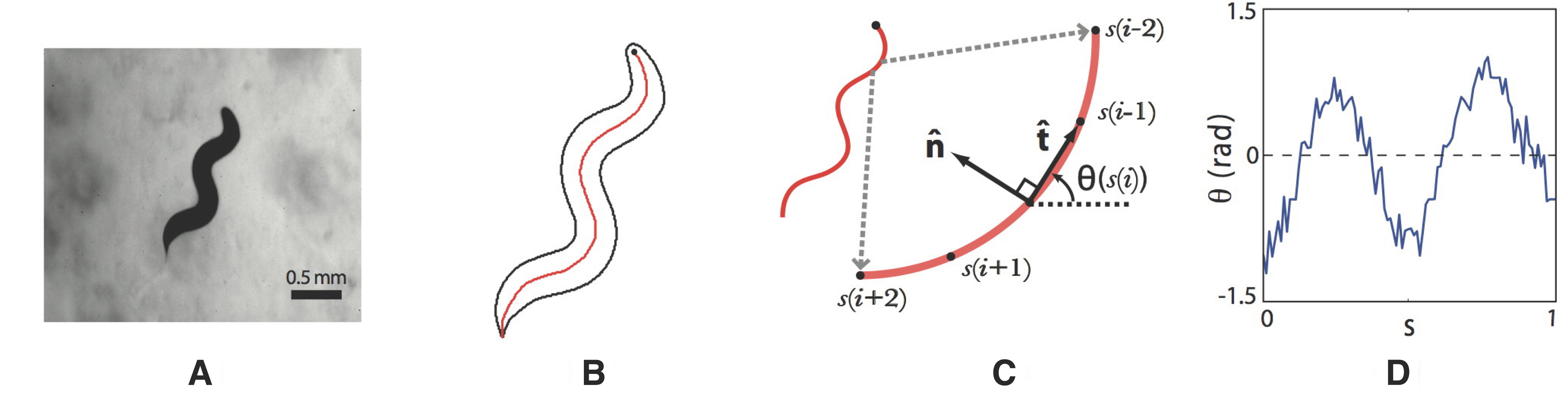 The image is 640x480 pixels, but we certainly should not need 307200 variables to describe the posture of the worm in this single frame. In fact, since the body shape of the worm is rather simple — a round tube of rather constant width — we may draw a center curve along the body to represent its shape in each frame. This curve can be described by an array of x and y coordinates for the points along the line. For example, we can divide the curve into 101 segments of equal length, then we can use the coordinates of the 102 endpoints to describe the curve. That amounts to 102 x 2 = 204 variables, a dramatic reduction from the number of pixels. Yet, we can still do a little better by noticing that the shape of the curve does not change if we rotate the whole image. That means we should use the relative positions of the points with respect to each other, not the absolute positions in the image. This can be done by using the angles of the segments as our variables, instead of the x-y coordinates of the endpoints. With that, we are down to 100 variables that can describe the shape of the worm in each frame. This procedure is illustrated in the figure below: